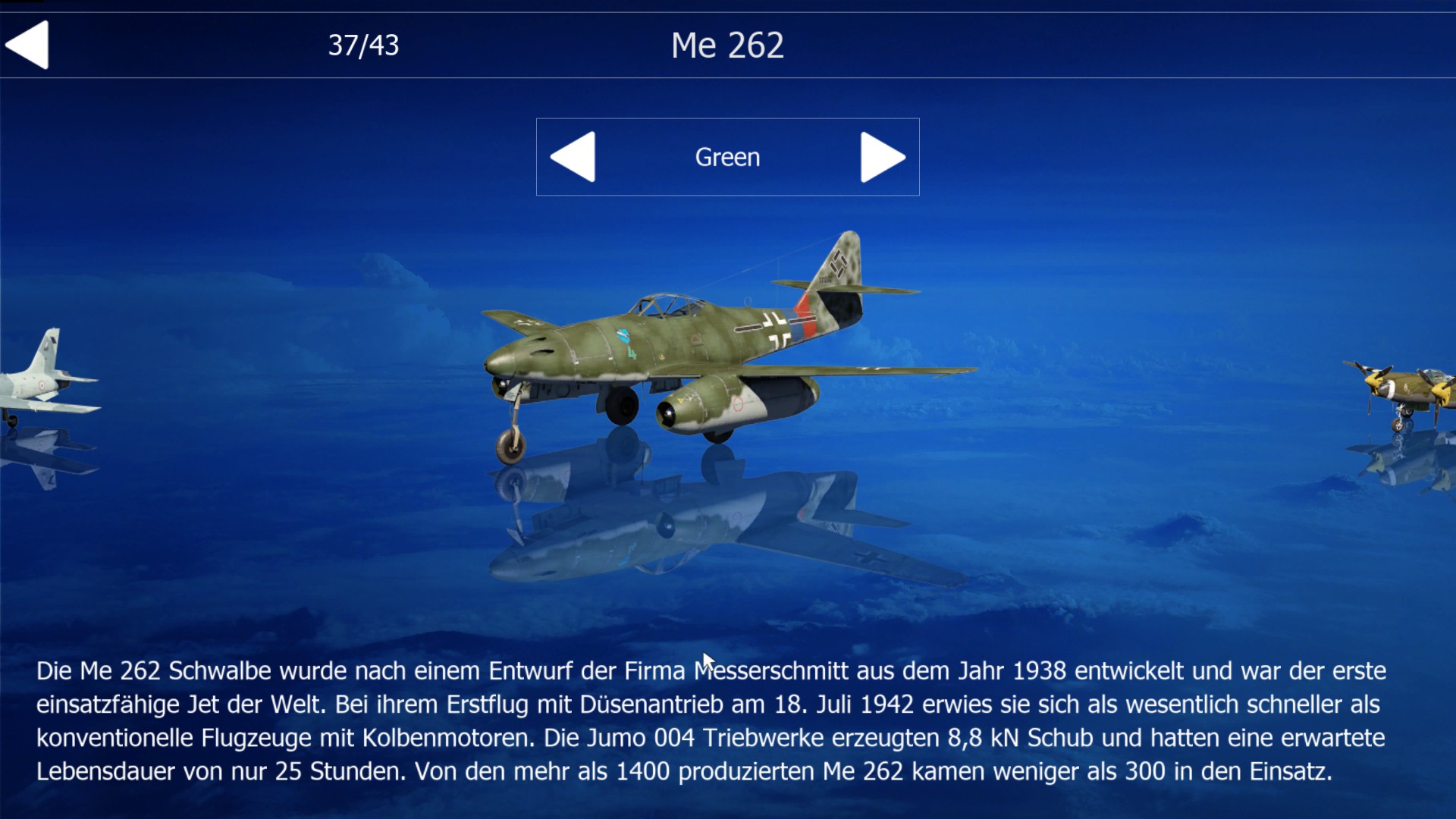 | Roland´s Homepage Impressionen aus dem FlugsimulatorAero Fly FS4 Flight Simulator Flug von Würzburg-Schenkenturm nach Nürnberg. Die Me 262 Schwalbe wurde nach einem Entwurf der Firma Messerschmitt aus dem Jahr 1938 entwickelt und war der erste einsatzfähige Jet der Welt. Bei ihrem Erstflug mit Düsenantrieb am 18. Juli 1942 erwies sie sich als wesentlich schneller als konventionelle Flugzeuge mit Kolbenmotoren. Die Jumo 004 Triebwerke erzeugten 8,8 kN Schub und hatten eine erwartete Lebensdauer von nur 25 Stunden. Von den mehr als 1400 produzierten Me 262 kamen weniger als 300 in den Einsatz. |