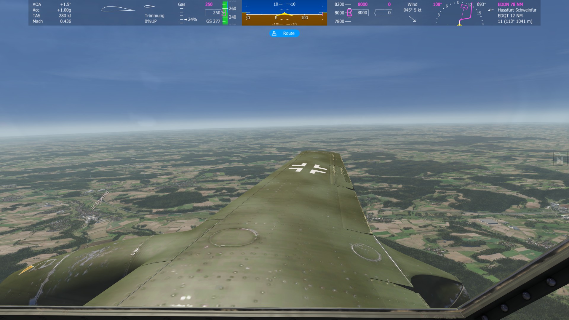 Beim Blick über die rechte Tragfläche sieht man Schlüsselfeld. |